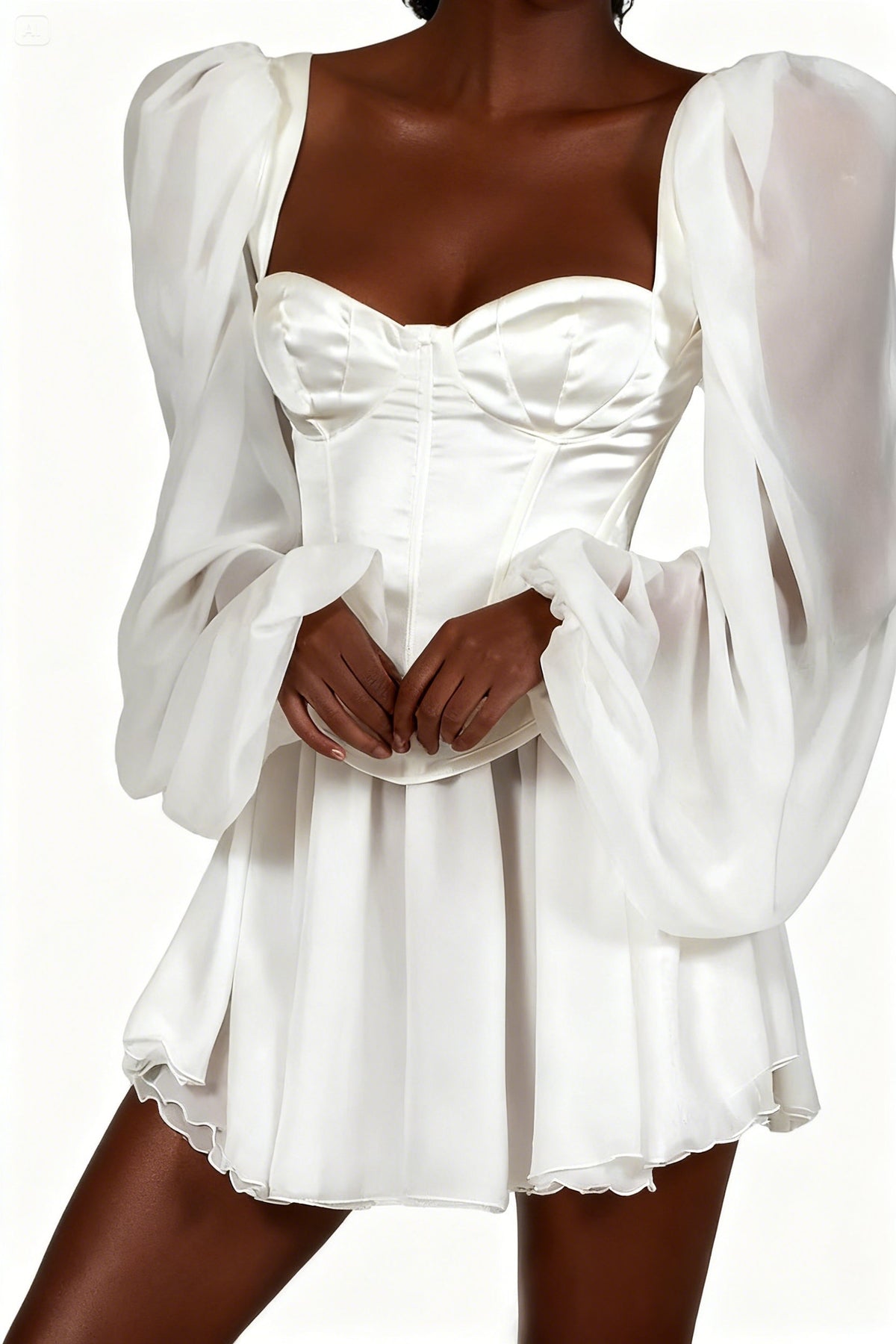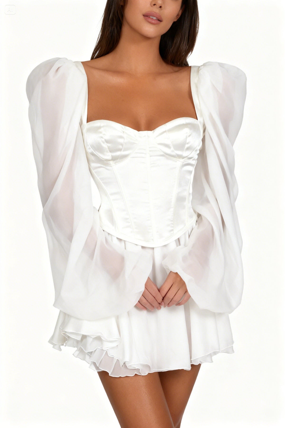 This elegant white bodycon chiffon dress features flowy lantern sleeves, creating a captivating and dramatic look perfect for any dance performance.