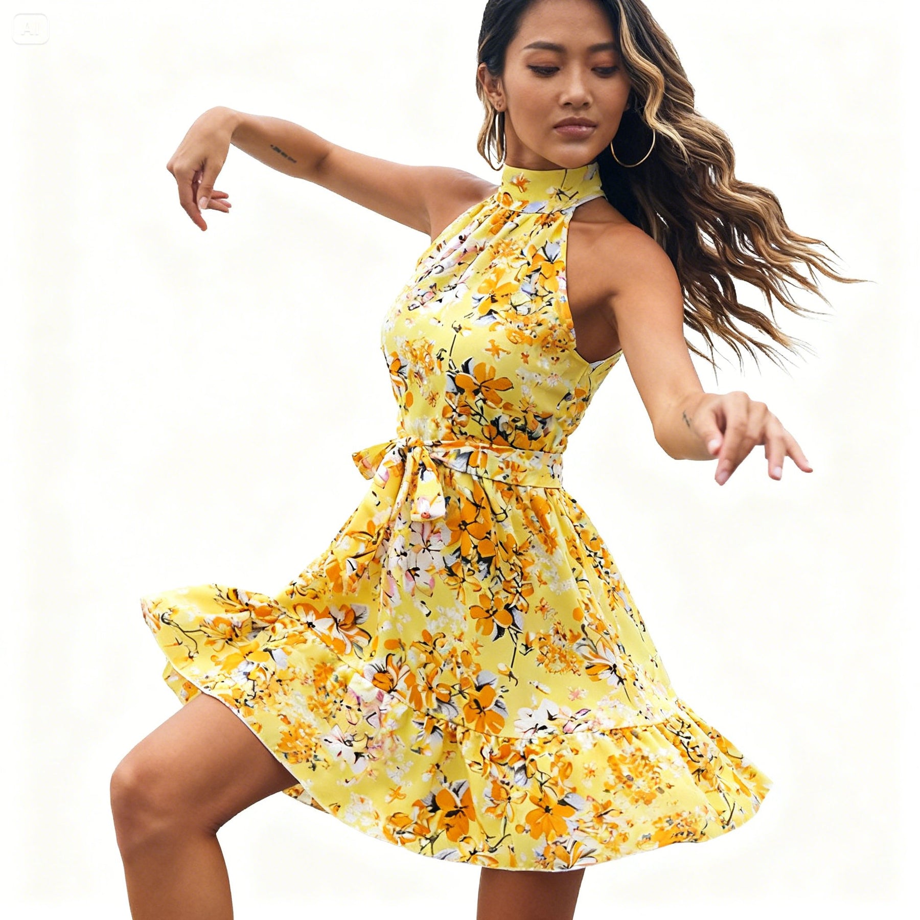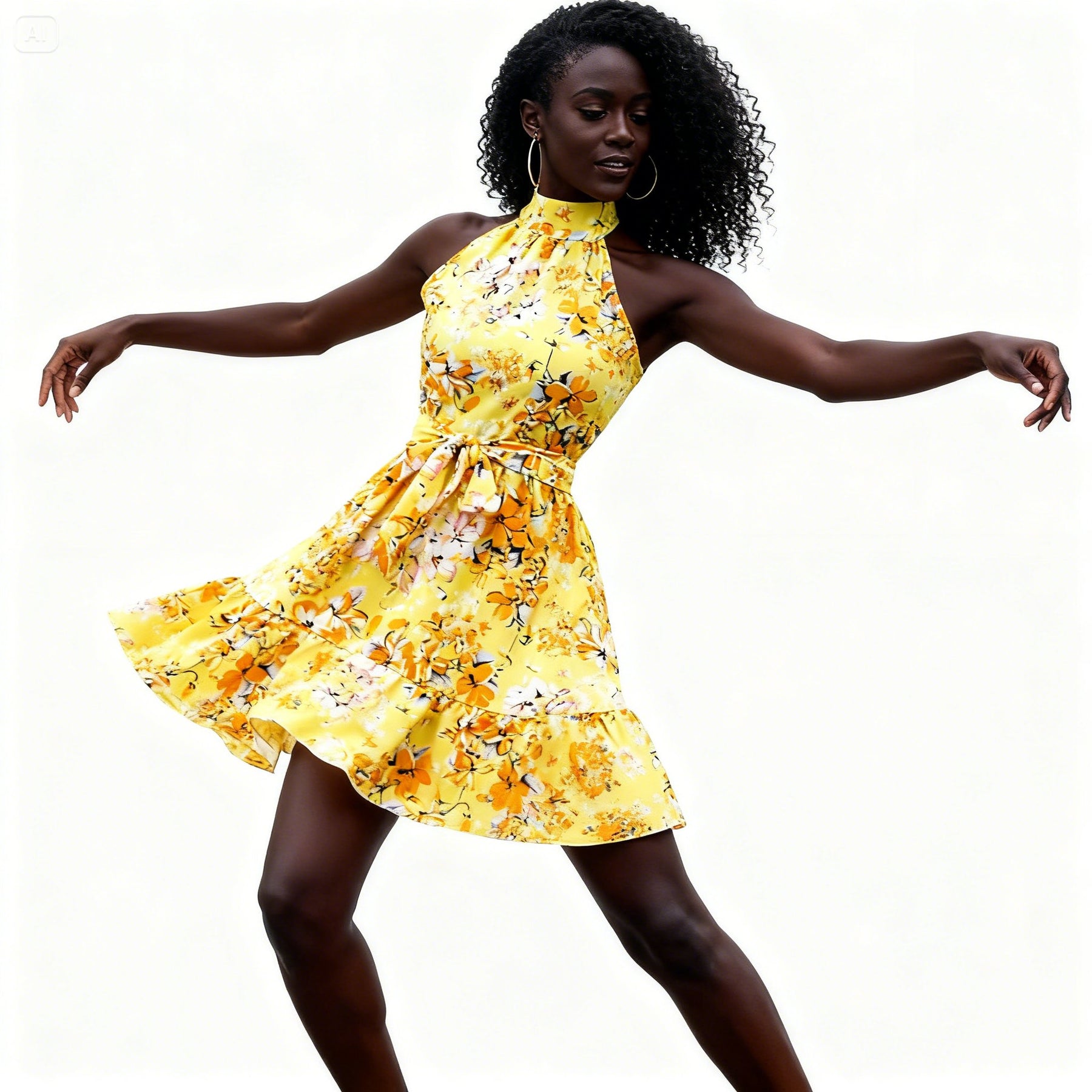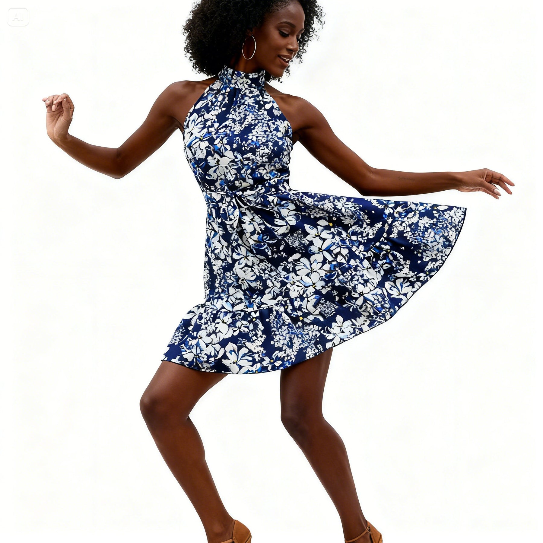 This summer floral halter dress offers a light, flowing look perfect for adding flair to your dance routines.