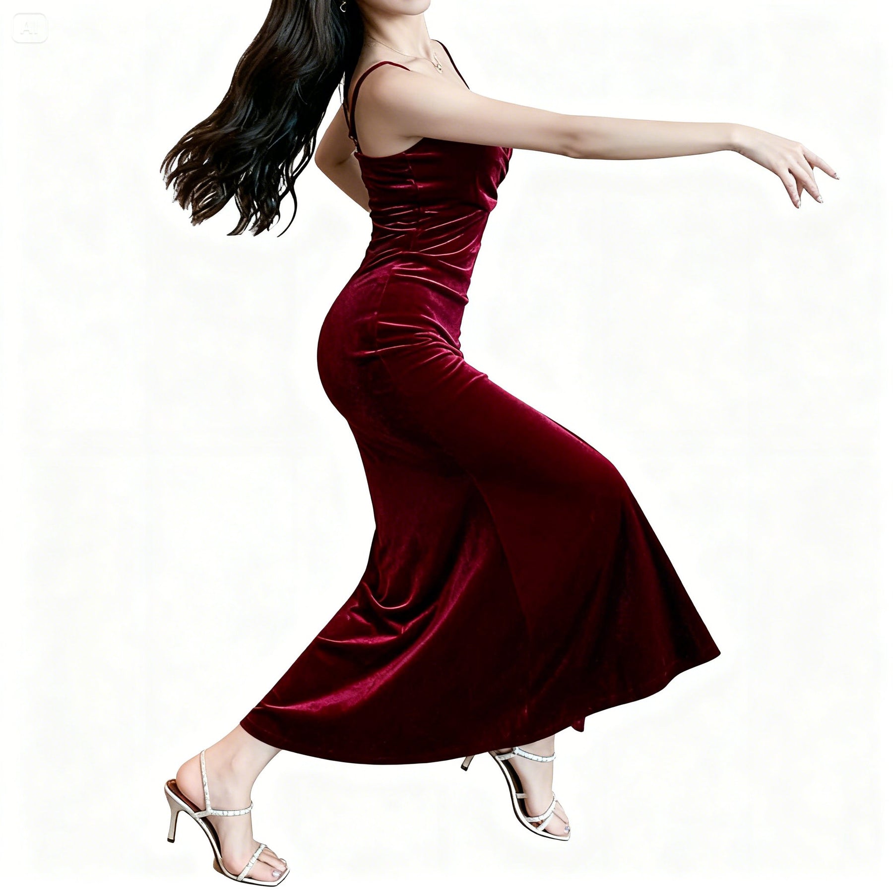 This velvet A-line slip dress offers stunning stage flow and a comfortable fit for any performance.