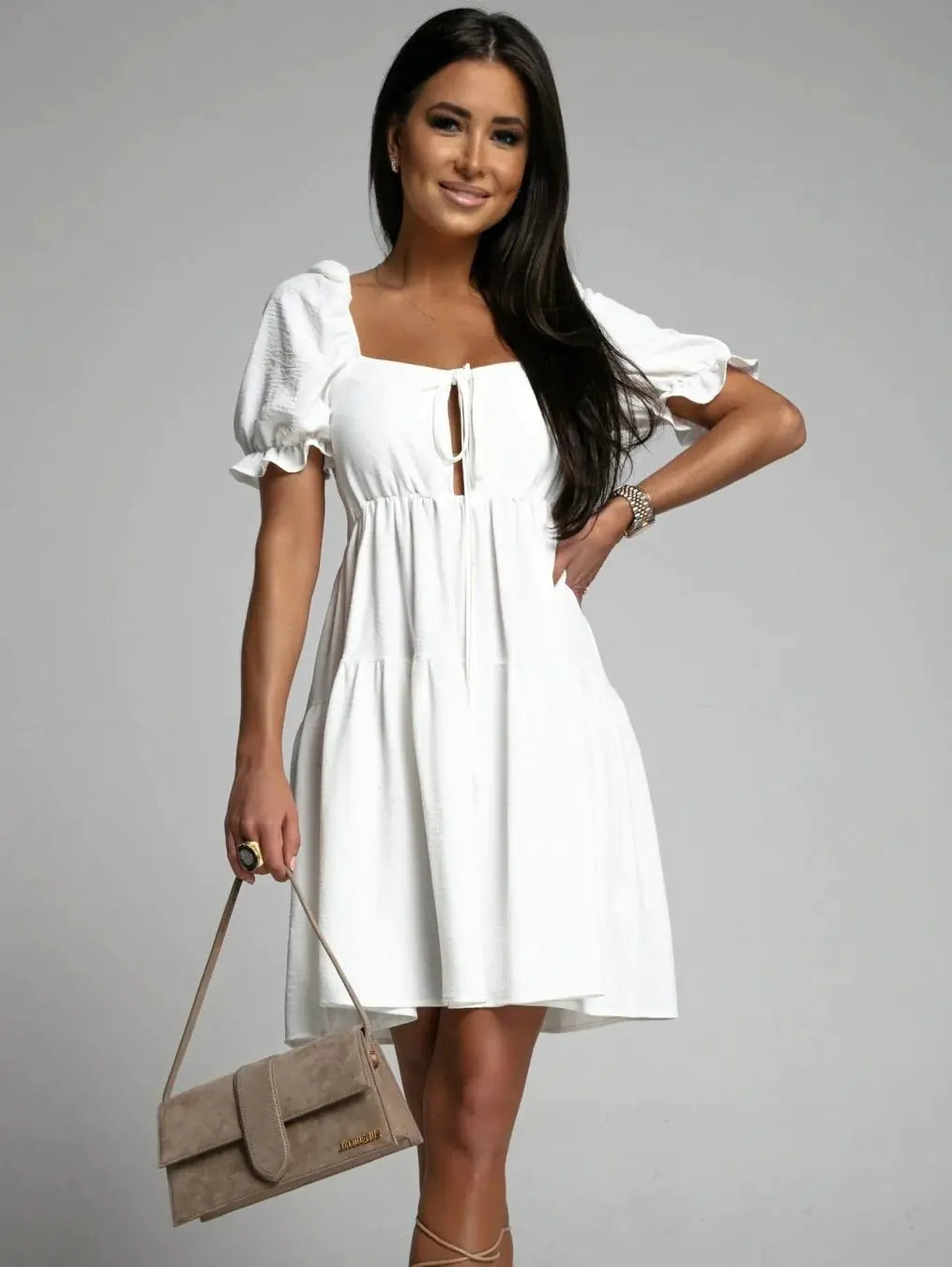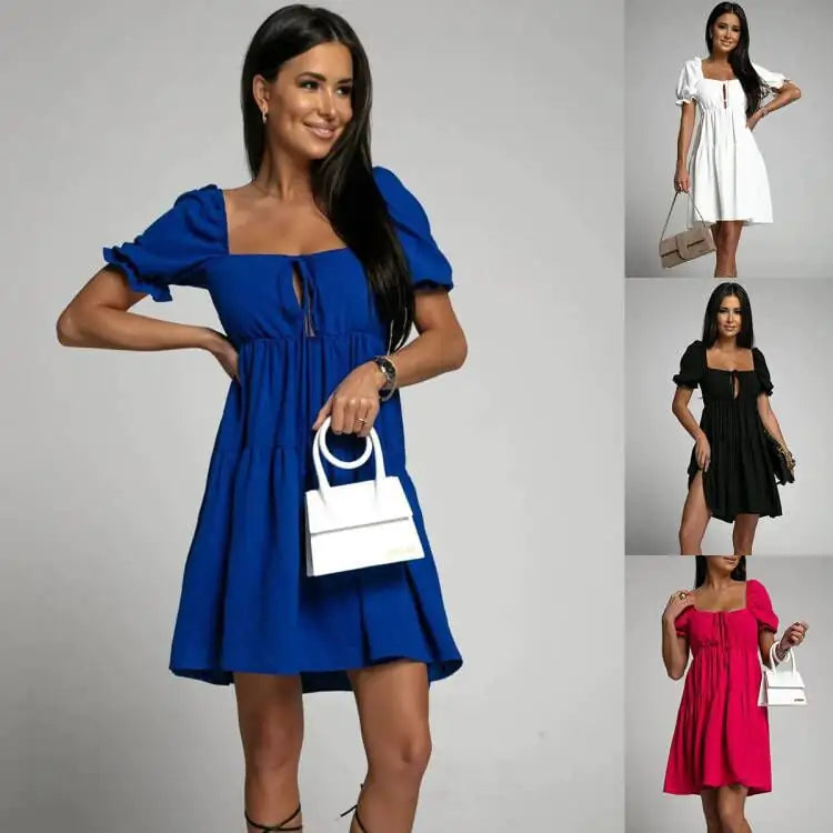Step into elegance with our Fashion Pleated Loose Solid Color Back Short Sleeve Dress. Designed for versatility and style, this dress is perfect for any occasion, whether you're heading to a casual brunch or a formal evening event.