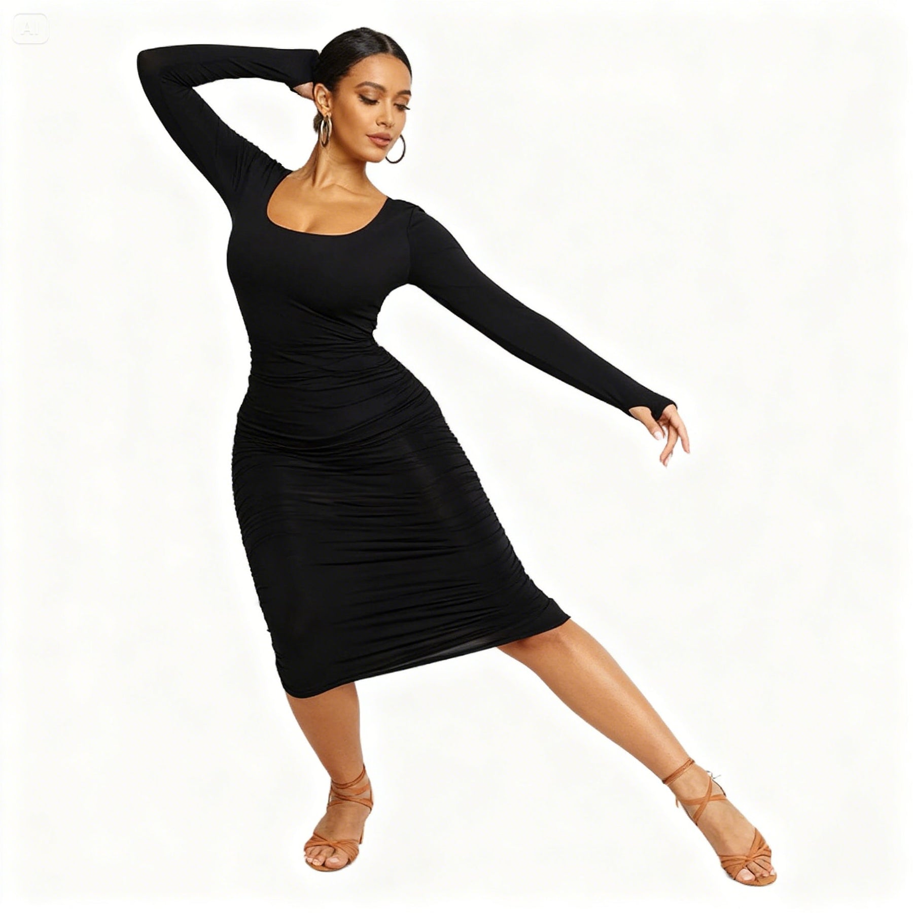 This flattering square neck dress offers a chic, confident look perfect for rehearsal or performance outings.