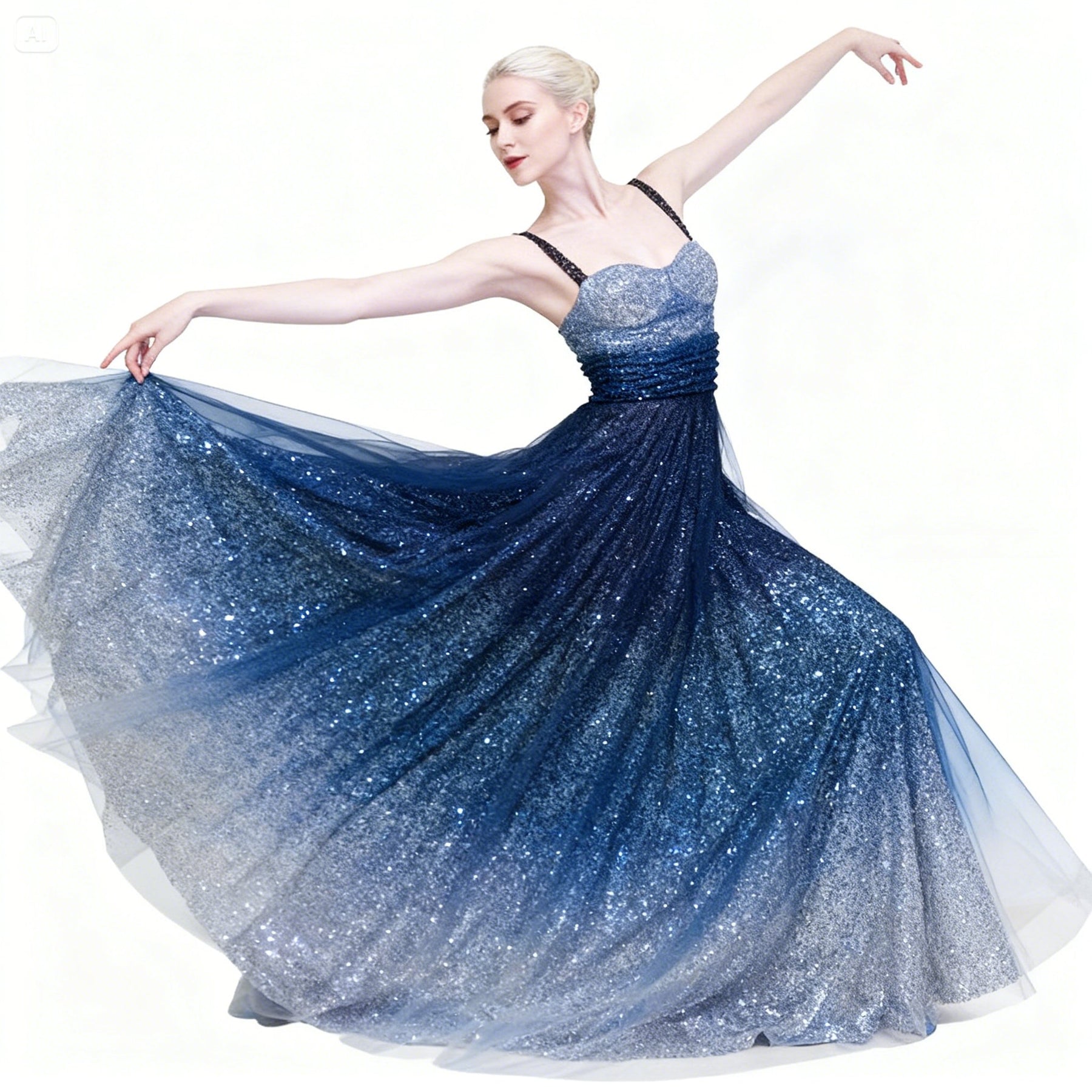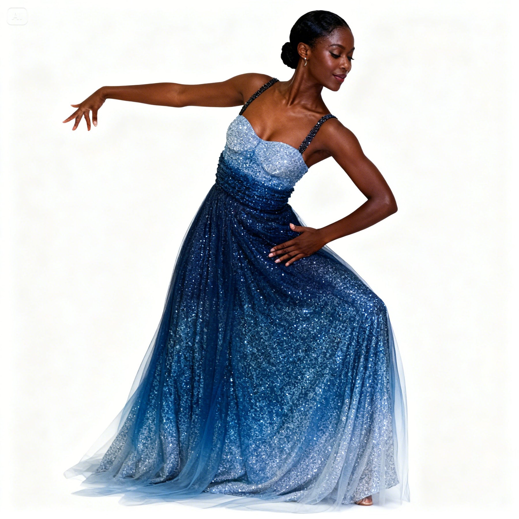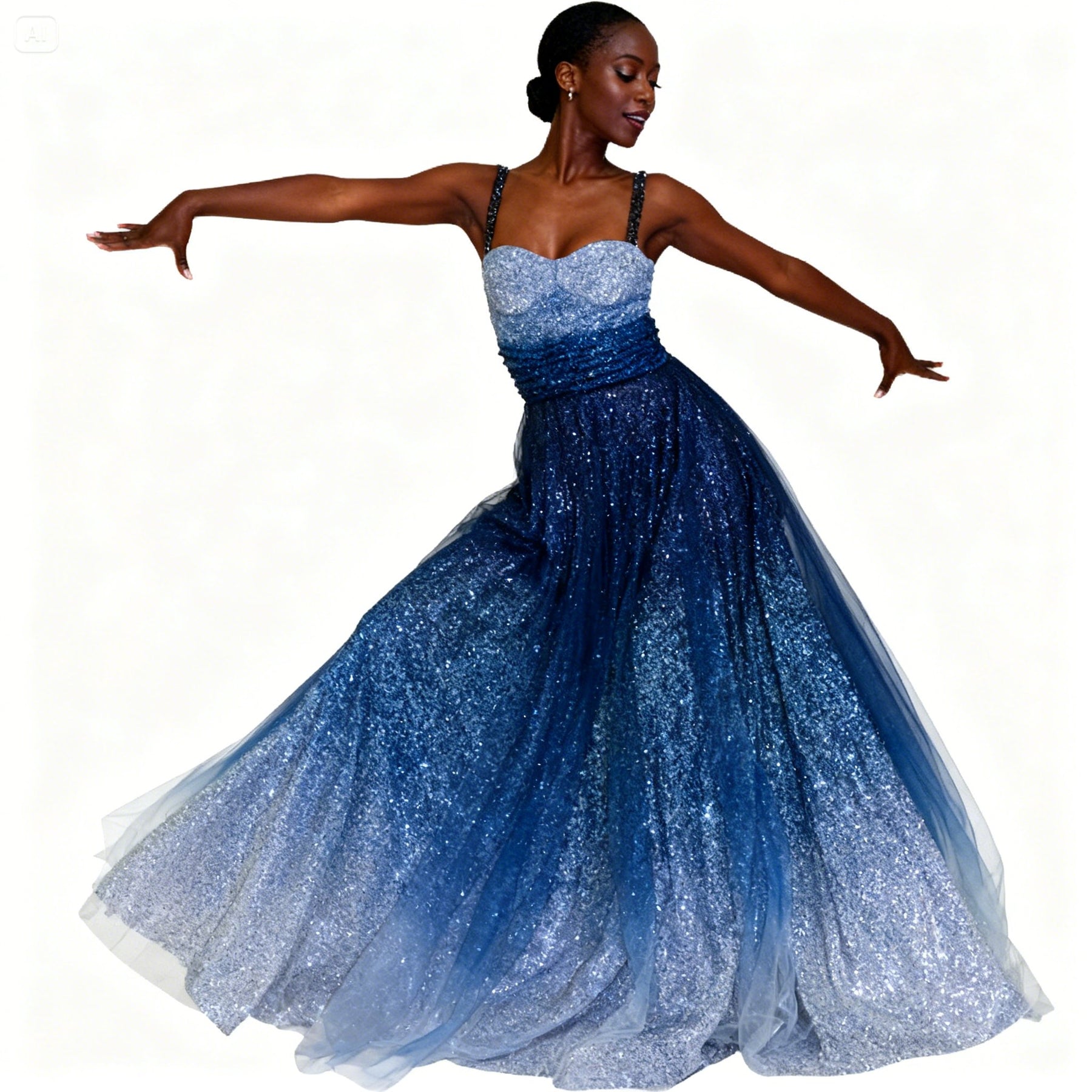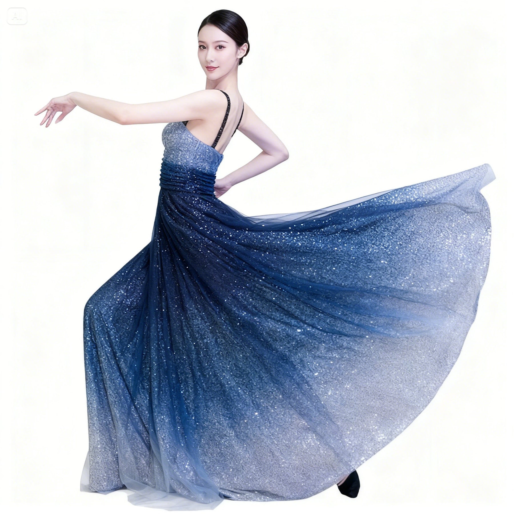 This elegant long gown is perfect for dancers needing stunning stage presence and easy movement at any event.