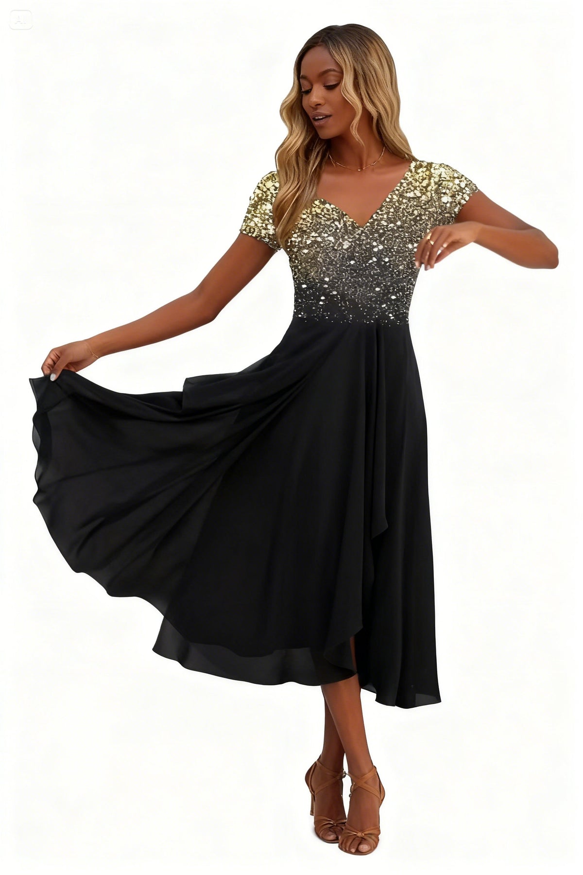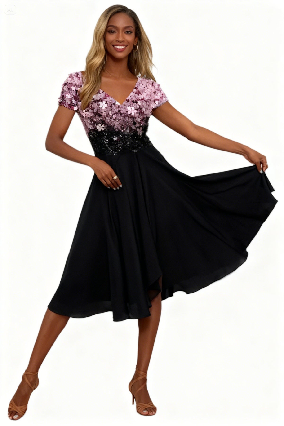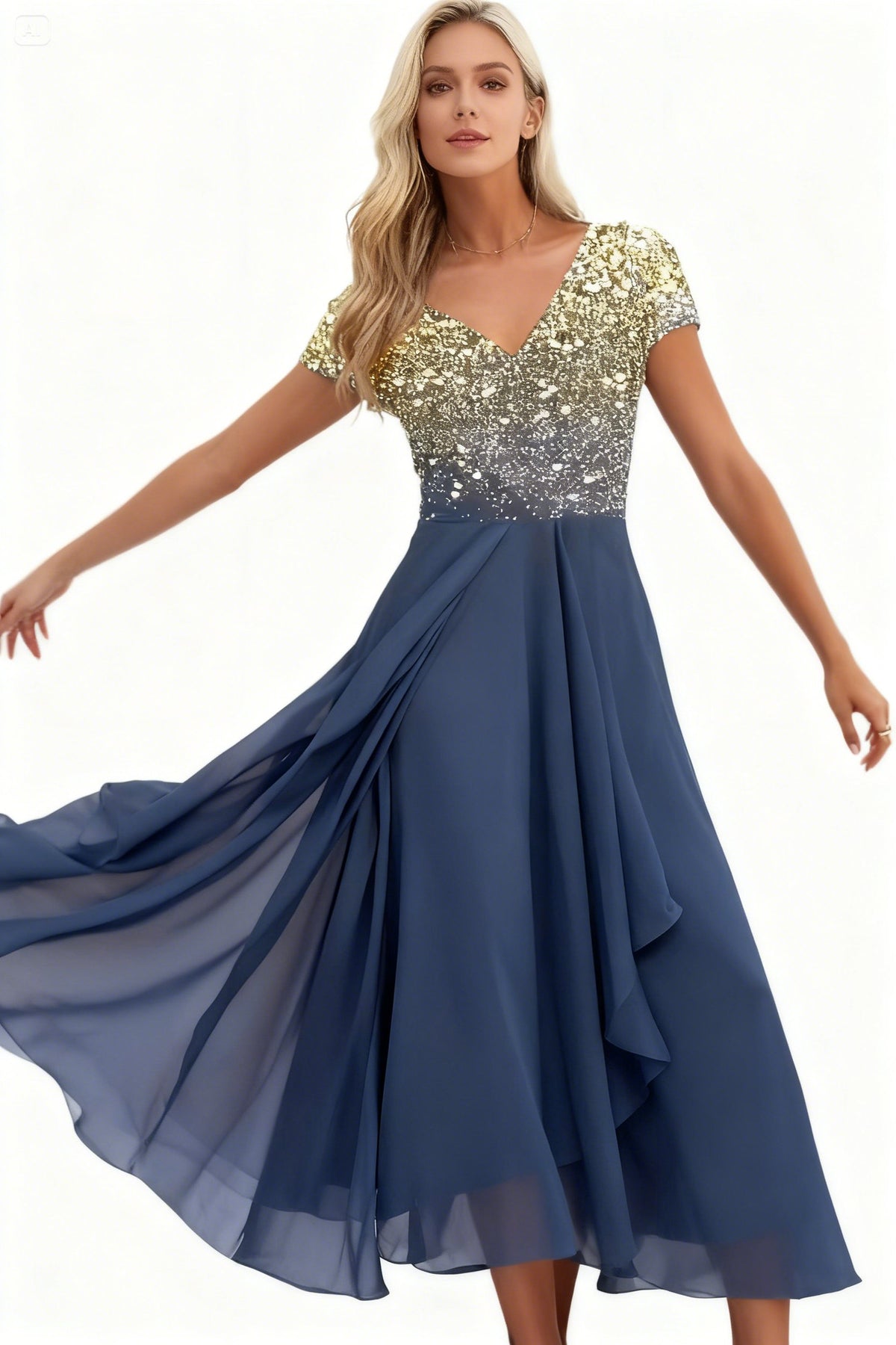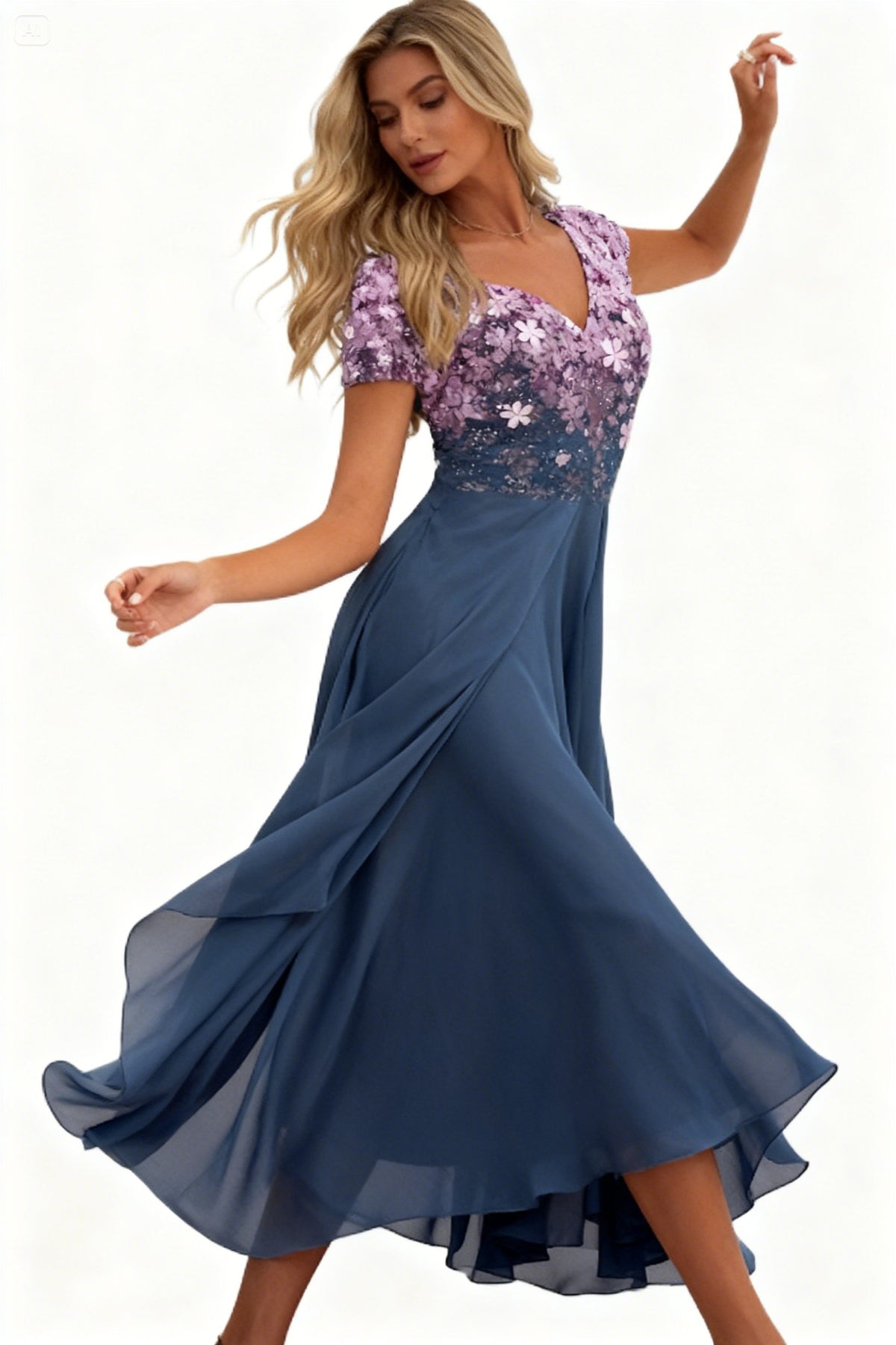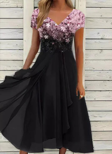 Step into the season with our chiffon party dress, expertly designed to elevate your summer wardrobe. This stunning dress features a v-neck collar and a conventional sleeve, perfect for any occasion, whether you're hitting the city or attending a garden party.