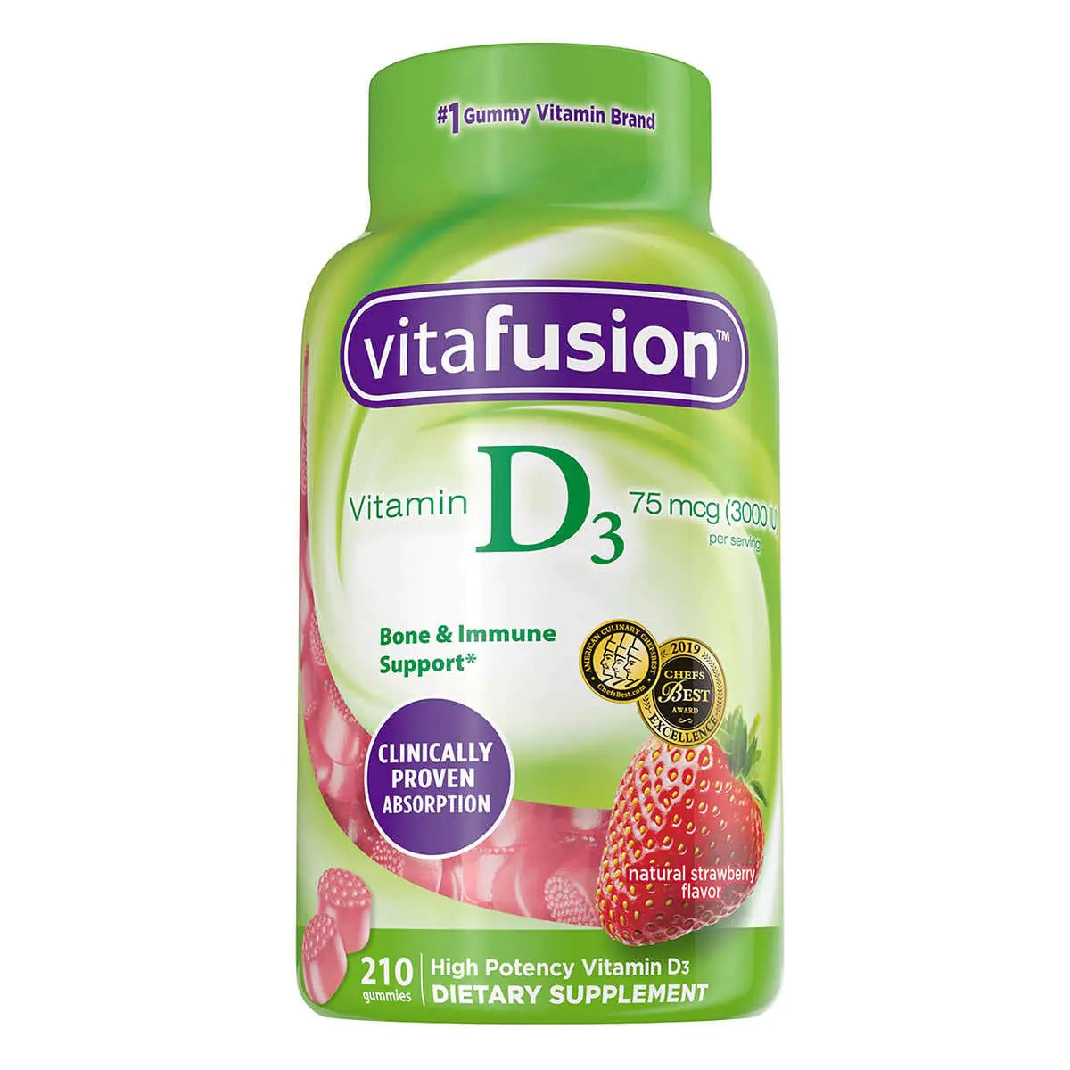 Get your nutrition from America’s #1 gummy vitamin brand‡! Each serving of vitafusion Vitamin D 3000 IU provides 375% daily value (3000 IU) of Vitamin D3! Also known as the “sunshine vitamin” Vitamin D3 aids in the absorption of Calcium and Phosphorus which help to form and maintain strong bones and teeth. It may also play a role in maintaining strong muscles. Vitamin D also helps support muscles and the immune system.