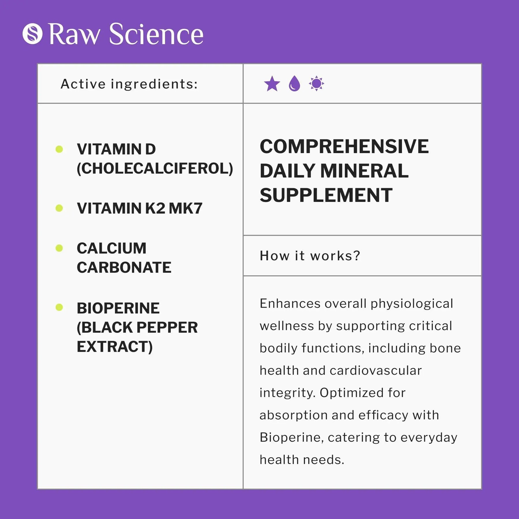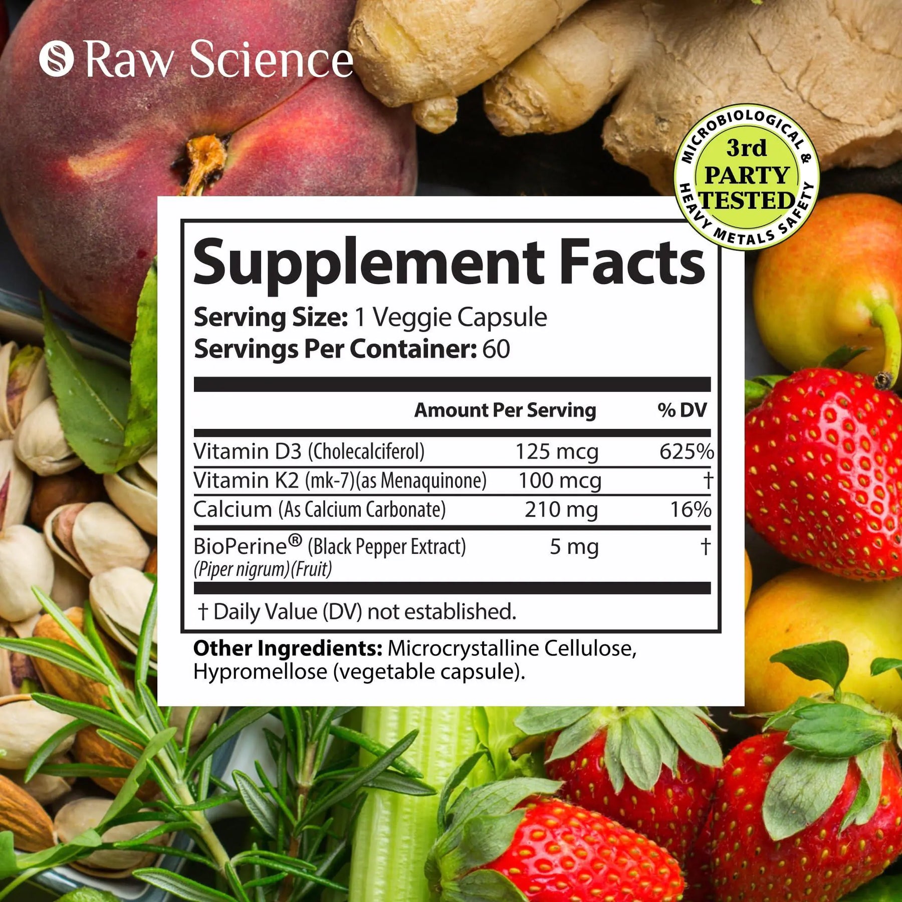 OPTIMAL CALCIUM & VITAMIN D3 COMBINATION Unlike the common Calcium 1200 mg with Vitamin D3 liquid formula, Calcium 600 mg with Vitamin D3 doses, or a 3in1 blend of Calcium 750 mg with vitamin D3 and K, our vitamin supplements increase effectiveness by Bioperine. Raw Science D3 & K2 capsules don't need the megadose for optimal calcium absorption.
