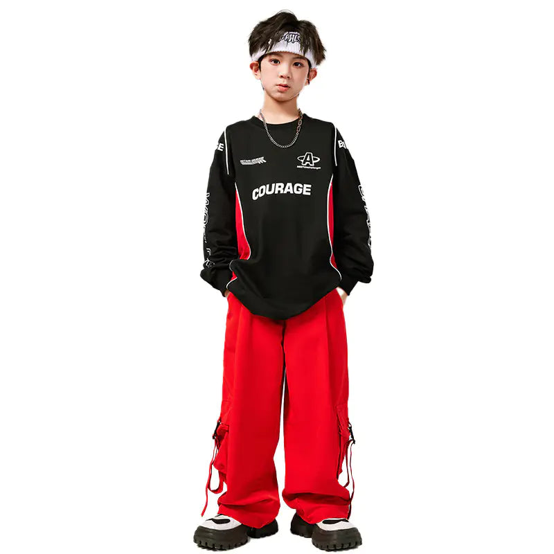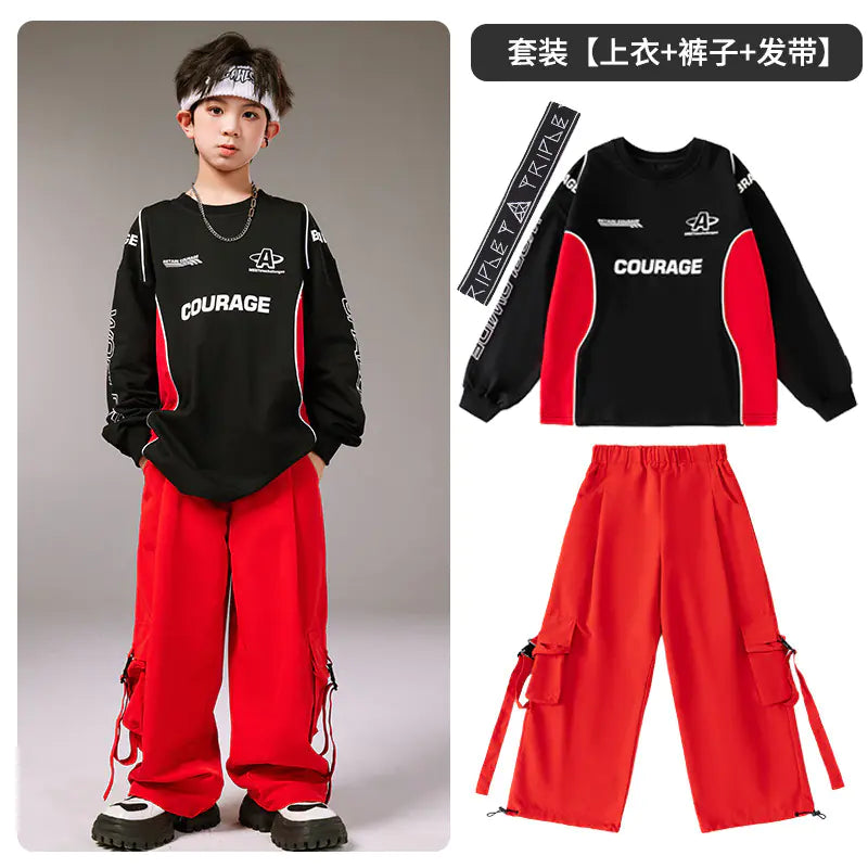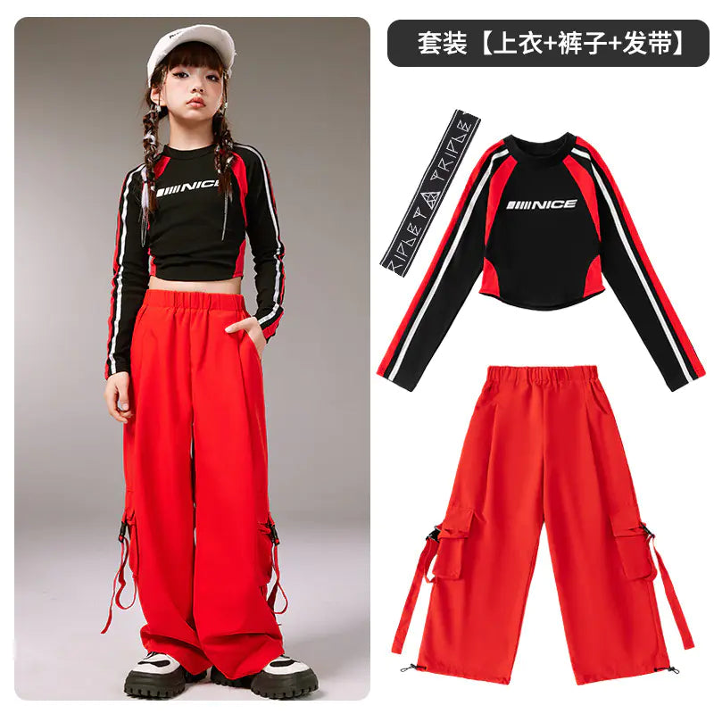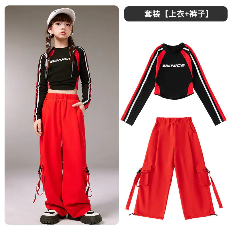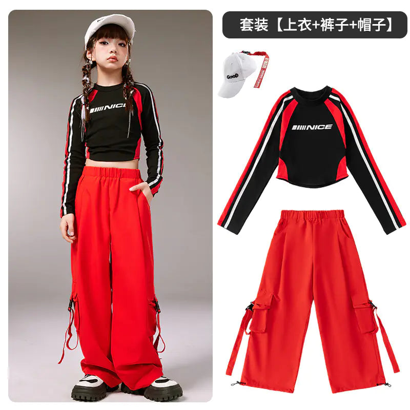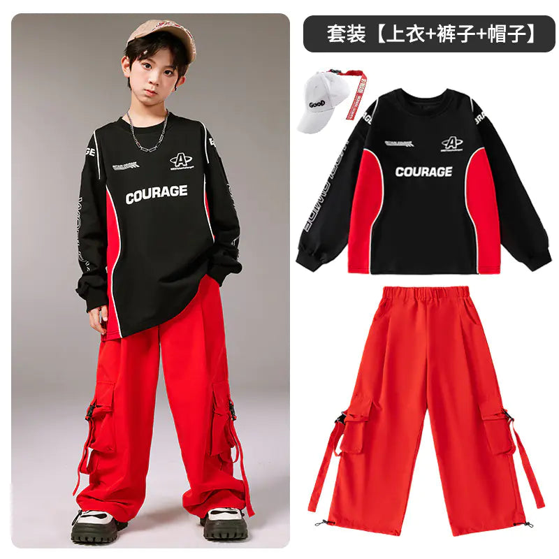 Available in various sizes to suit different heights, our dancewear combines a trendy look with functional design. Choose from exciting color combinations like the striking black and red motorcycle long sleeve paired with red ribbon overalls, or opt for a complete set that includes stylish accessories like a symbol hair band or a trendy white baseball cap.