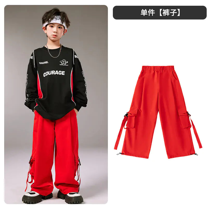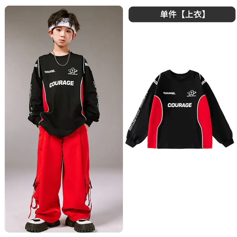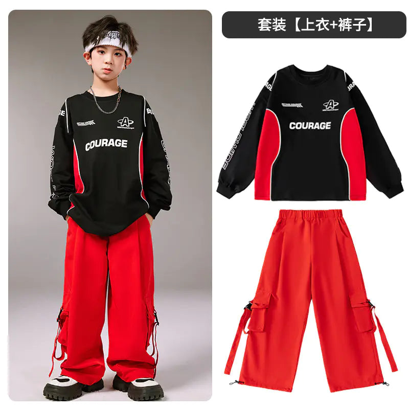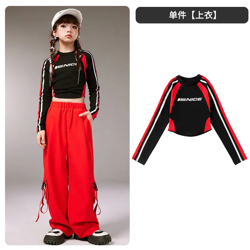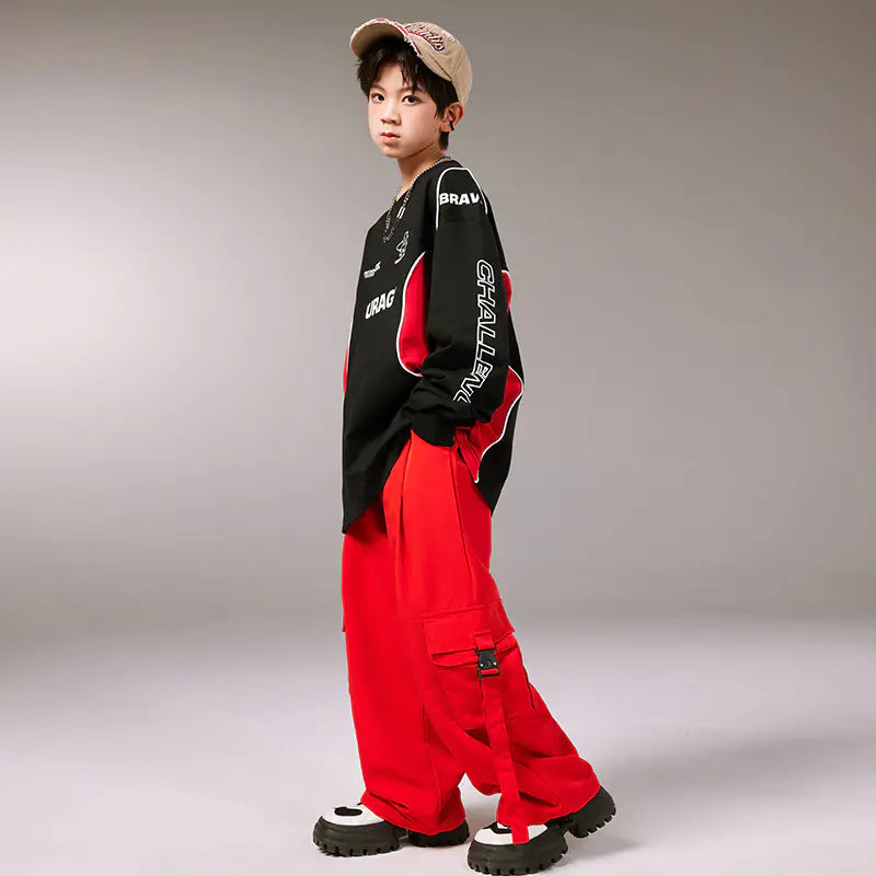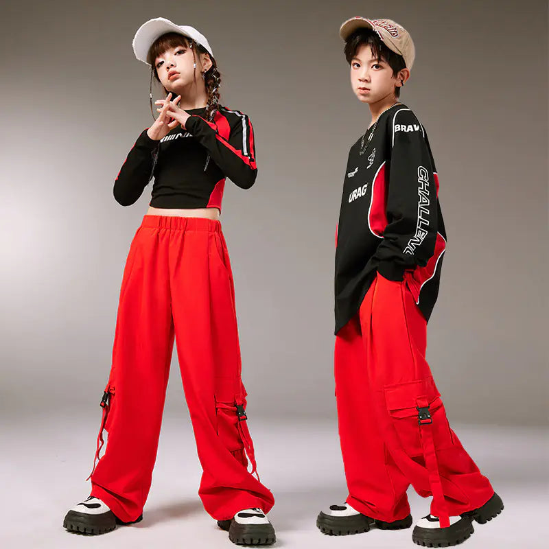 Available in various sizes to suit different heights, our dancewear combines a trendy look with functional design. Choose from exciting color combinations like the striking black and red motorcycle long sleeve paired with red ribbon overalls, or opt for a complete set that includes stylish accessories like a symbol hair band or a trendy white baseball cap.