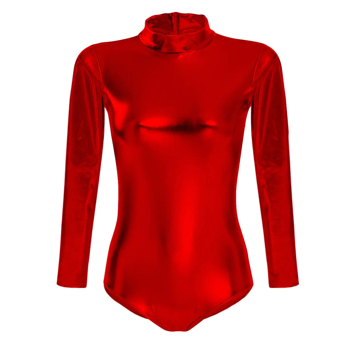 ODIZLI Women Shiny Metallic Long Sleeve Leotard Mock Turtleneck One Piece Bodysuit for Gymnastics Ballet Dance Red S