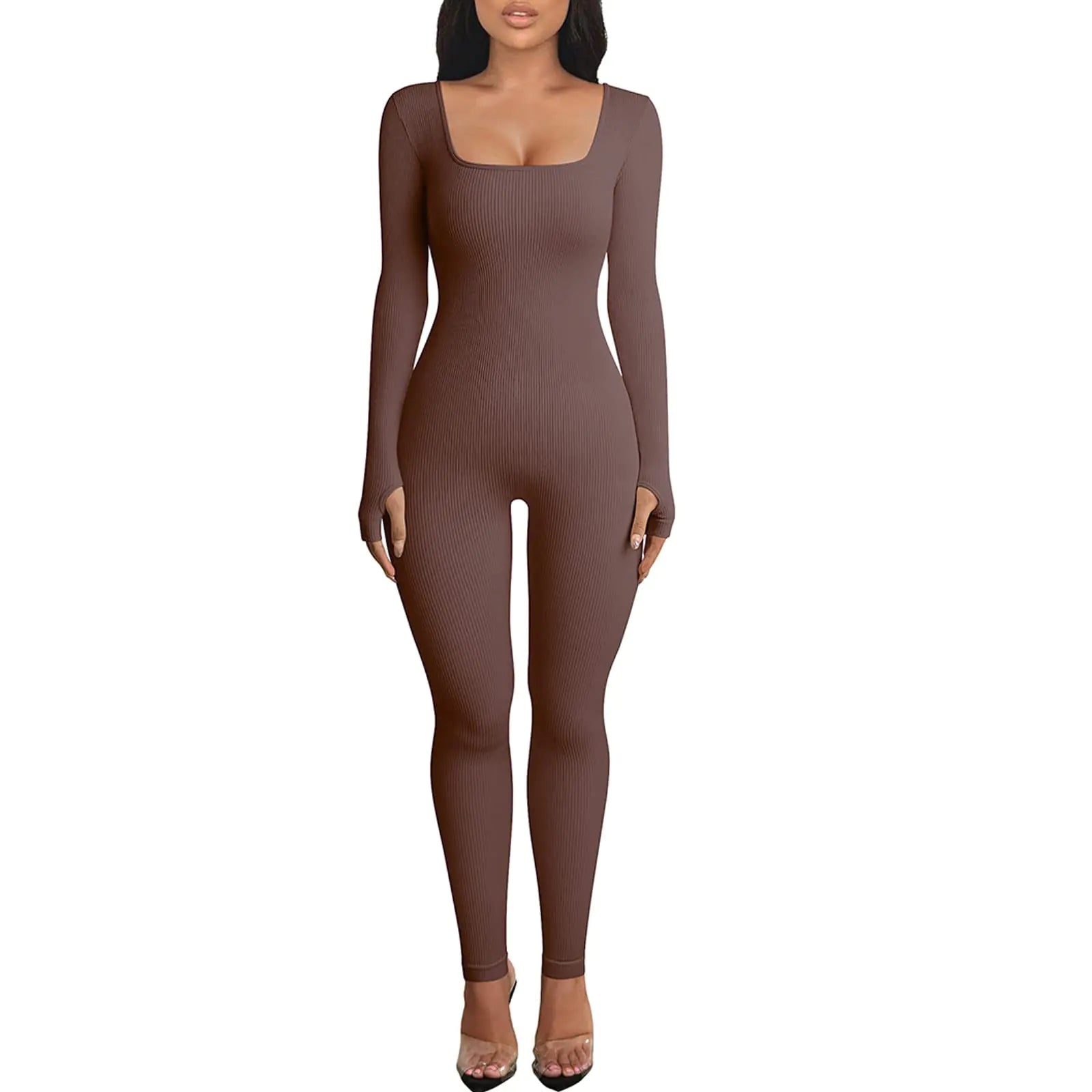 ["Thick material in elastic yoga jumpsuits provides incredible comfort. The jumpsuits are designed with ribbed textured tummy control contour and shape your curves enhancing your bodys natural shape. non-see through providing you with confidence and peace of mind during your yoga sessions or any other activities." The Square neck jumpsuit is made with soft fabric that offers high elasticity comfort and breathability. This jumpsuit features a 4-way stretch fabric that offers compression butt lifting support to upper leg muscles and reduces muscle vibrations. Triangular crotch design makes jumpsuits super flattering offers ample coverage and prevents thighs from rubbing as you move from pose to pose. The leggings crotch provides greater freedom of movement without sacrificing support and durability. Our long sleeve full-length Romper with a square neckline can be easily paired with high-heeled shoes boots sandals cardigans jackets and other accessories. The versatile outfit not only gives you a fashionable look but also provides comfort and warmth during the fall and winter seasons. The ribbed jumpsuits can be worn for various occasions such as parties cocktails casual outings clubs brunches picnics work balls gym sessions and sports. They are also a beautiful choice for a date adding charm and making you look youthful and vigorous.]