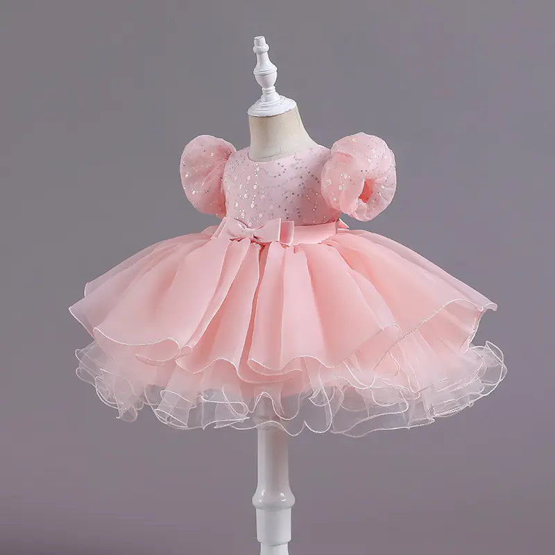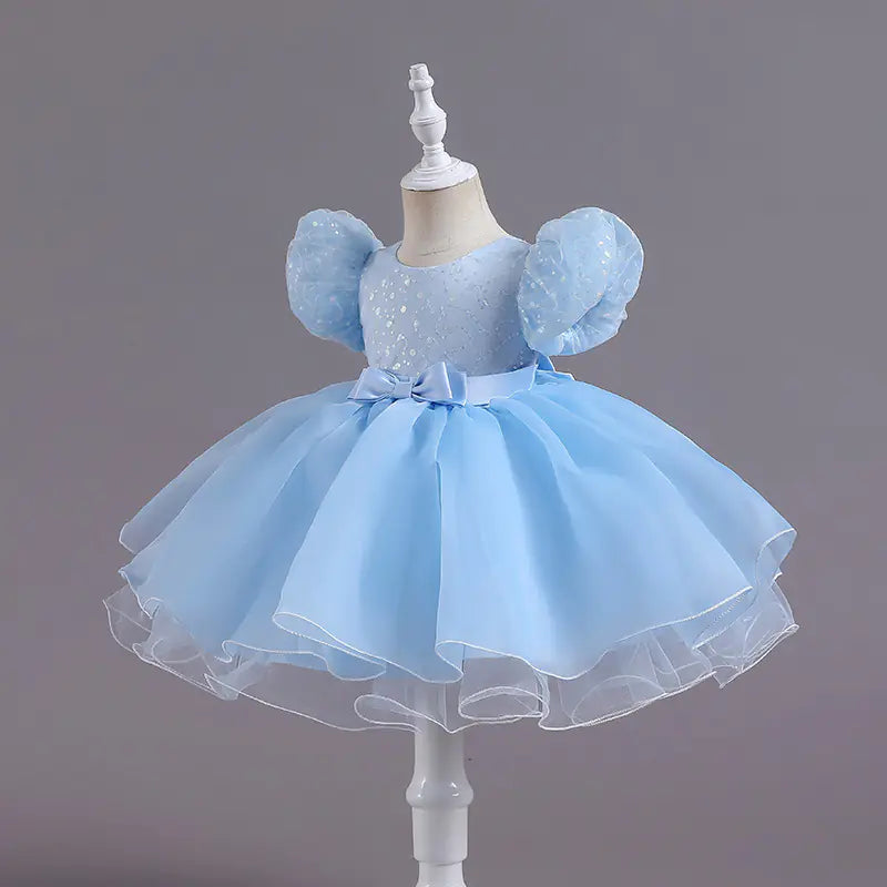 Elevate your little one's dance performance with our stunning Sequined Puff Sleeve Lace Mesh Bubble Skirt Dress. Designed for young performers who love to shine on stage, this enchanting dress is perfect for any dance recital or performance.
