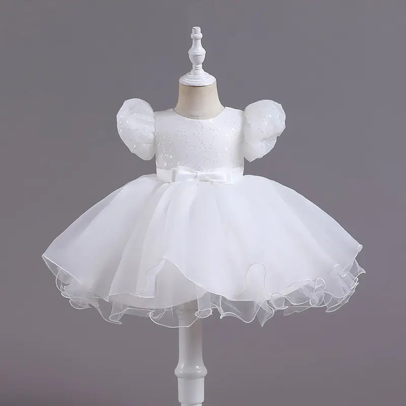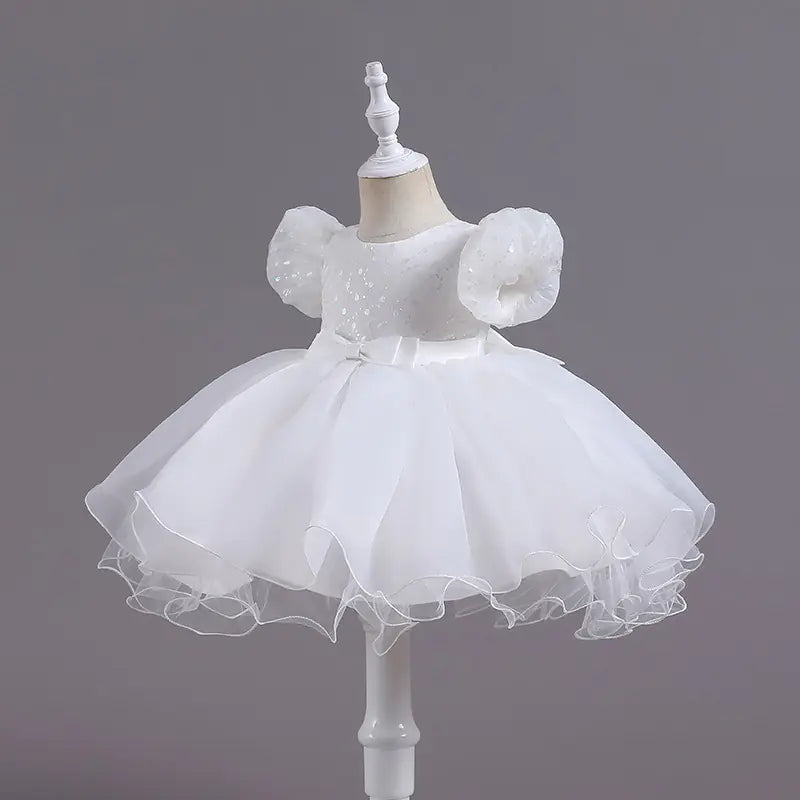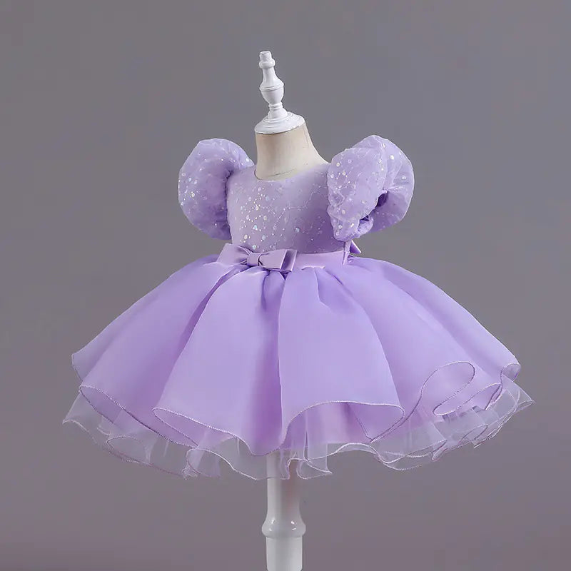 The dress features a beautiful bubble skirt adorned with sequins that catch the light, creating a magical effect as your child moves. The puff sleeves add a delightful princess touch, making every girl feel like royalty. Crafted from soft cotton with a comfortable polyester fiber lining, it's designed to provide both style and ease of movement.