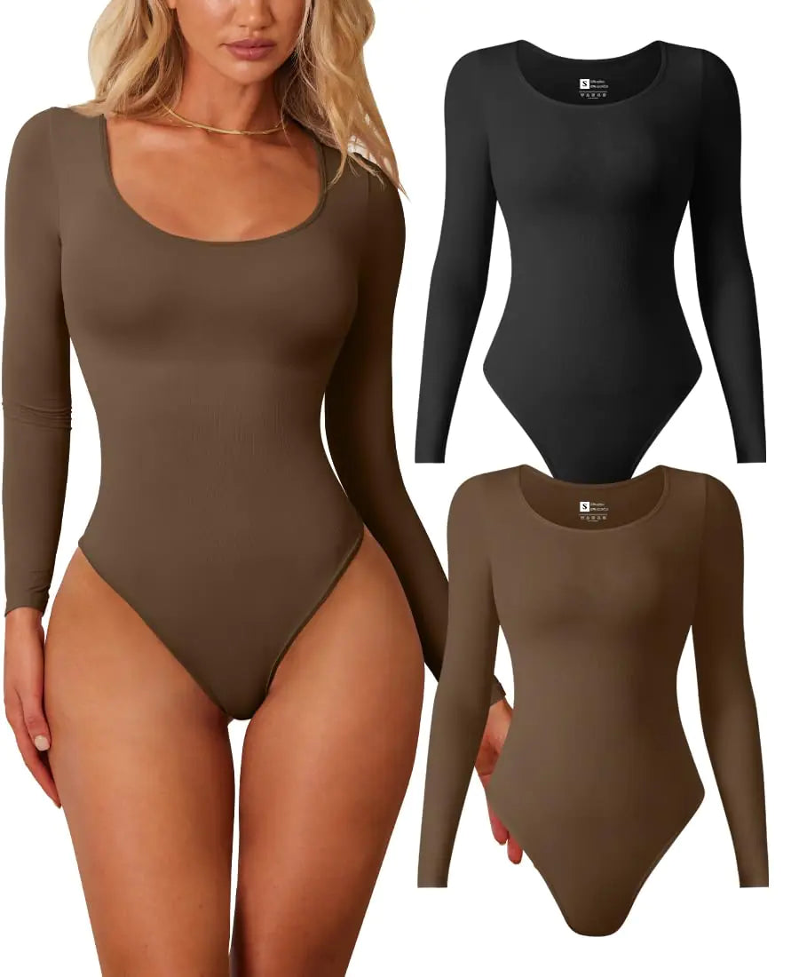 HYZ Womens 2 Piece Leotard Fall Long Sleeve Seamless Going Out Bodysuit Tops Black Coffee