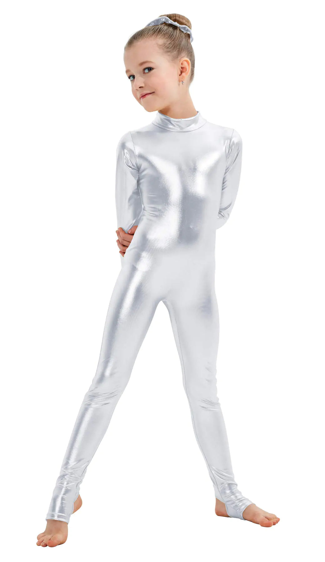 Kepblom Girls Shiny Metallic Mock Neck Unitard Long Sleeve Zipper Back One Piece Bodysuit Costume