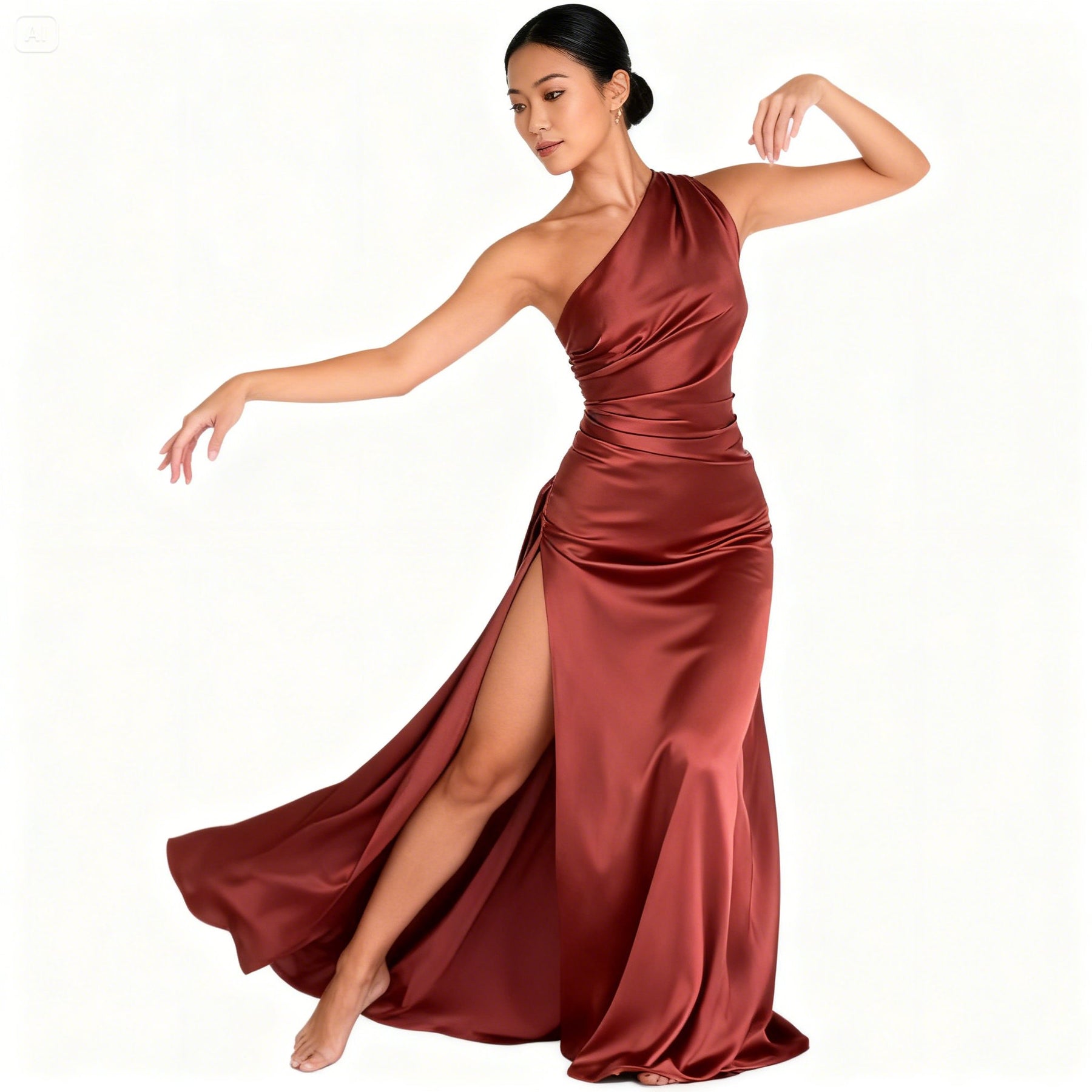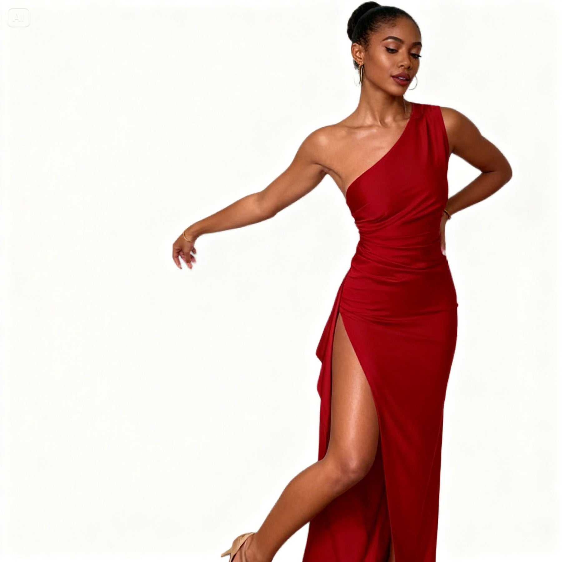 Turn heads with this captivating One-Shoulder Backless Slit Dress. Designed to accentuate your curves, this dress features a seductive one-shoulder neckline, a daring backless design, and a stylish slit for added allure. Crafted from luxurious satin fabric, this dress exudes elegance and sophistication.