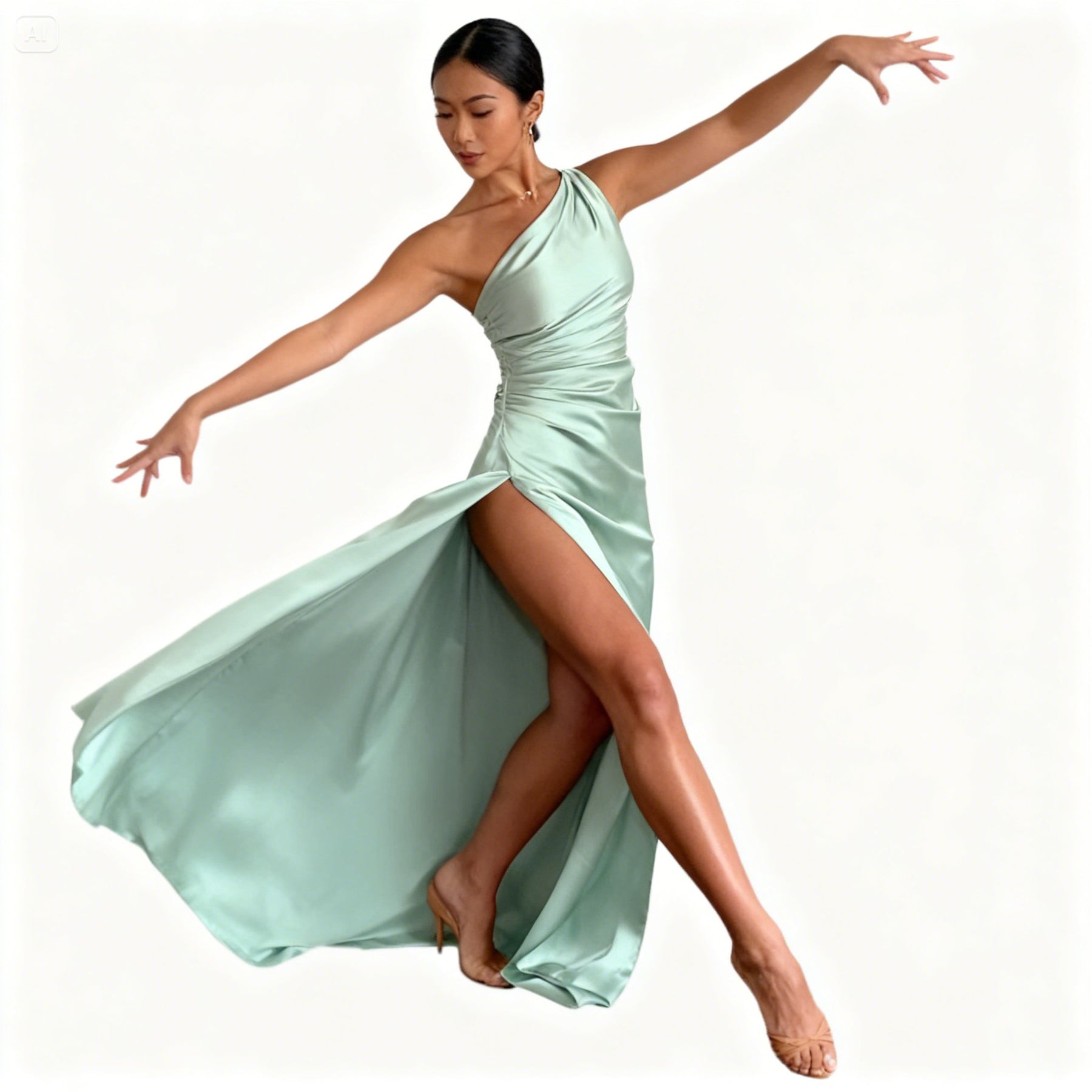 This luxurious satin slit dress offers maximum visual drama and freedom of movement for performance.