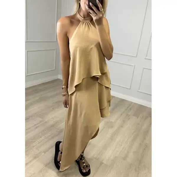 Step into elegance and charm with our Crossbody Halter Layered Dress. This stunning dress features a unique asymmetric skirt that gracefully flows, making it the perfect choice for any social gathering. Available in a variety of rich colors, including orange, blue, black, purple, and khaki, you can effortlessly express your personal style.