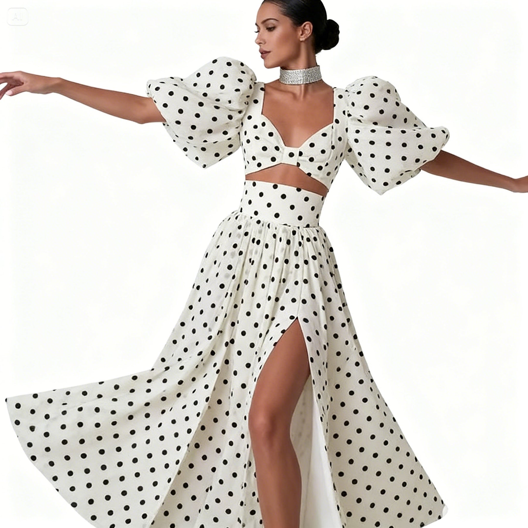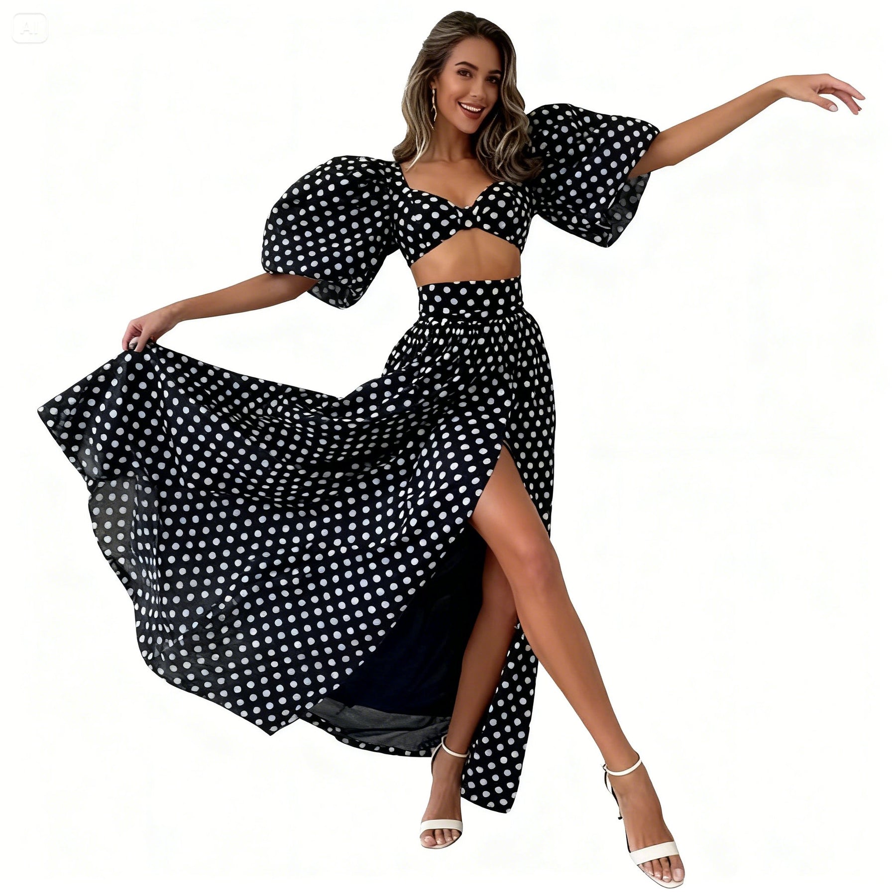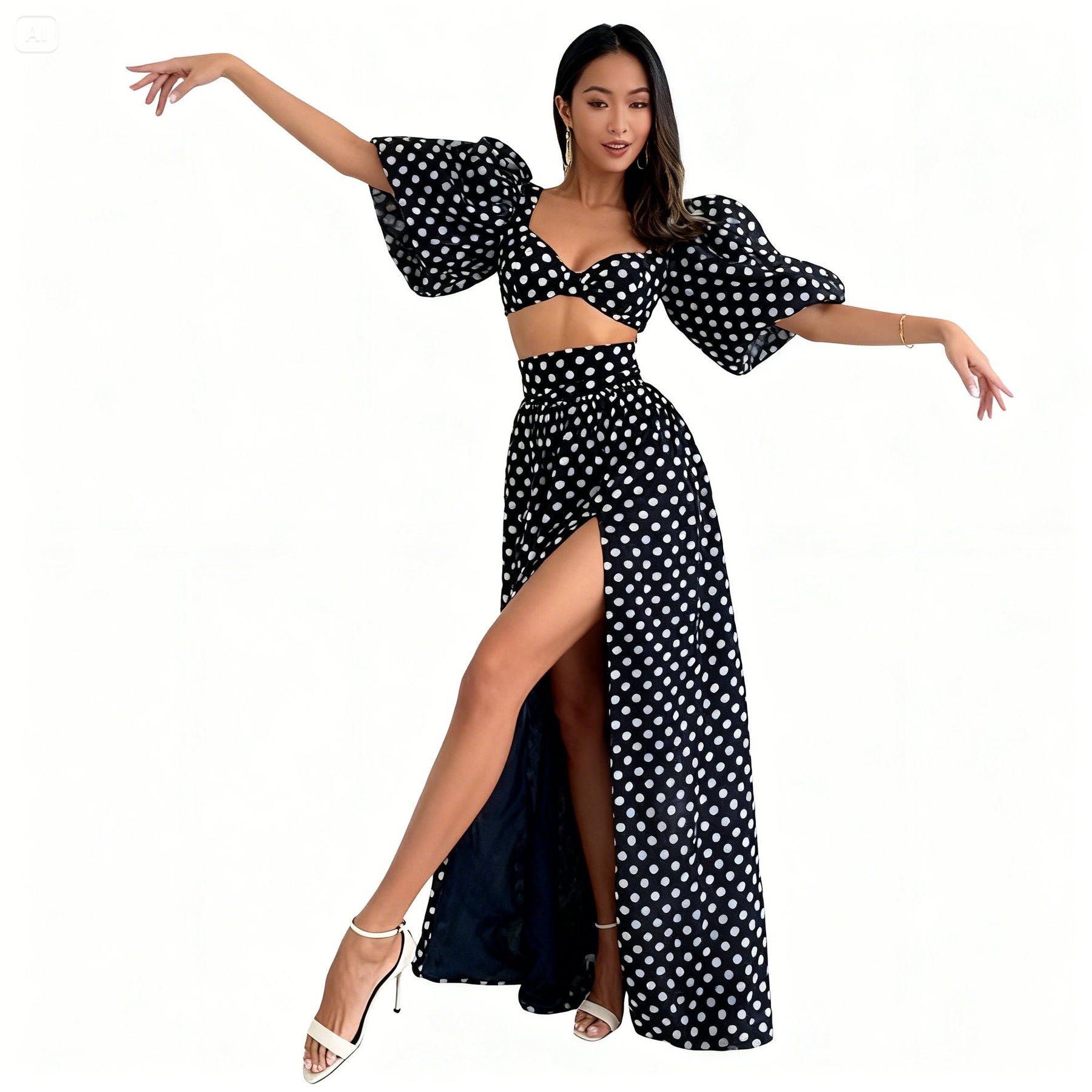 Step out in style with the PolkaChic Square-Neck Puff Sleeve Dress Suit, designed to bring a touch of elegance and fun to your wardrobe. The flattering square-neck top with puff sleeves is paired with a high-waist slit skirt, creating a chic and feminine silhouette. The playful polka dot print adds a trendy, retro flair, making this dress suit perfect for a variety of occasions—from brunch dates to evening events. Whether dressed up with heels or paired with casual footwear, this dress suit is sure to turn heads and keep you feeling confident.