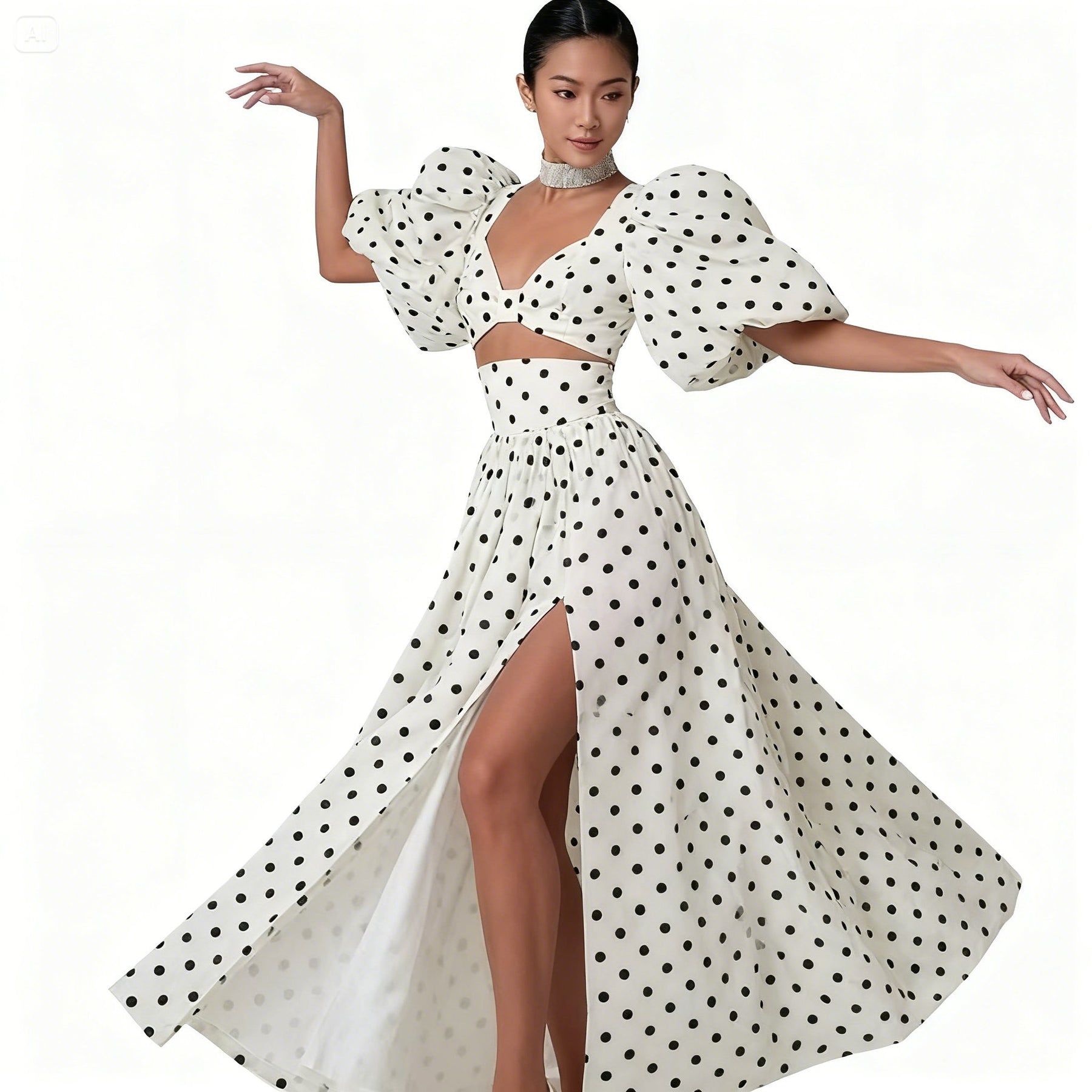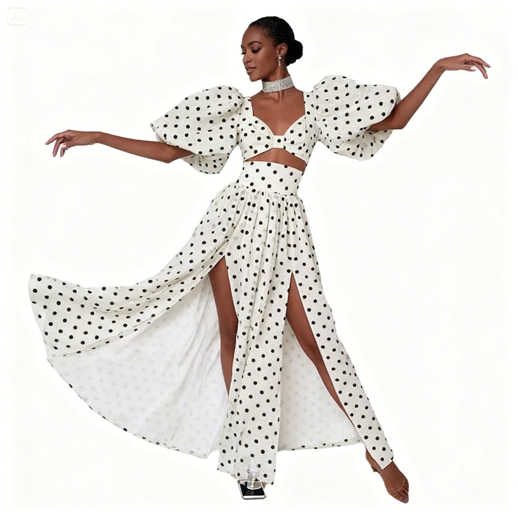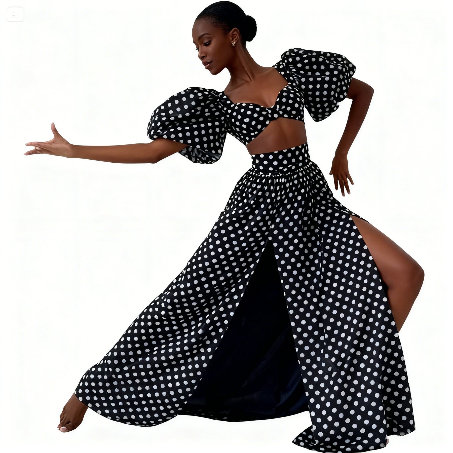 Step out in style with the PolkaChic Square-Neck Puff Sleeve Dress Suit, designed to bring a touch of elegance and fun to your wardrobe. The flattering square-neck top with puff sleeves is paired with a high-waist slit skirt, creating a chic and feminine silhouette. The playful polka dot print adds a trendy, retro flair, making this dress suit perfect for a variety of occasions—from brunch dates to evening events. Whether dressed up with heels or paired with casual footwear, this dress suit is sure to turn heads and keep you feeling confident.