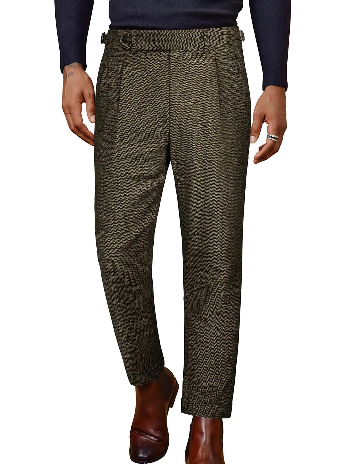 [FEATURES: Herringbone pattern tweed trousers double pleated dress pants regular fit straight fit zipper closure casual pants and business dress pants COMFORTABLE TO WEAR: With the added internal expansion tabs on the waistline there was plenty of give for free movement while standing sitting bending kneeling etc. VINTAGE STYLE: The herringbone pattern and italian naples style make this pants vintage and classic OCCASIONS: Dress up or down. Perfect for casual wear party office school cocktail hunting festival christmas day cold weather etc. You can pair it with tweed vest sport coat peacoat dress shirts sweaters. CARE: Machine wash or hand wash]